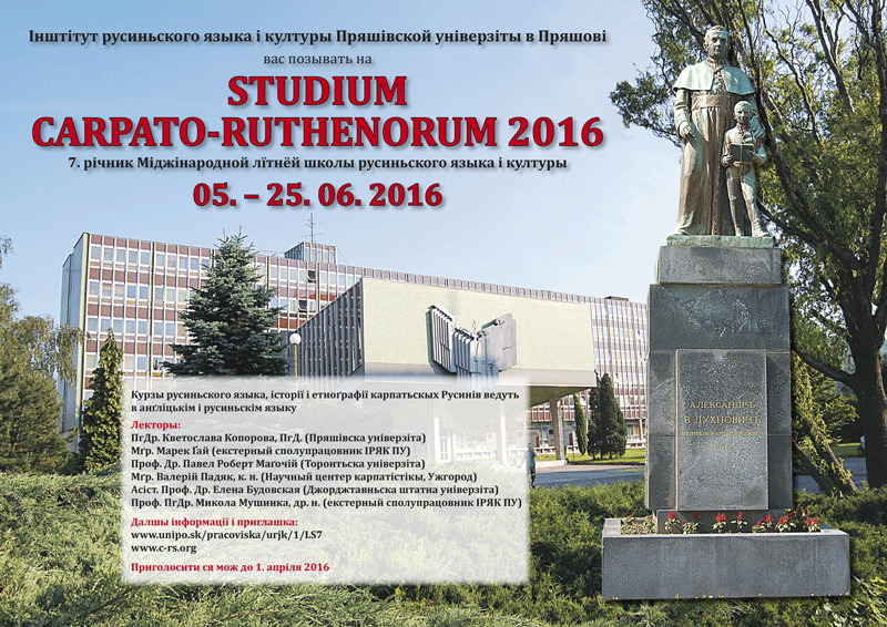 Міджінародна лїтня школа русиньского языка і културы Studium Carpato-Ruthenorum 2016 є орґанізована Інштітутом русиньского языка і културы Пряшівской універзіты. Пряшівска універзіта в Пряшові є єдинов універзітов у Словацькій републіцї, котра реалізує навчаня акредітованого бакаларьского, маґістерьского і докторьского штудійного проґраму русиньскый язык і література, ґестором котрого є Інштітут русиньского языка і културы. Вдяка ёго 3-тыжднёвому едукачному проєкту Studium Carpato-Ruthenorum – Міджінародна лїтня школа русиньского языка і културы Пряшівска універзіта є сучасно єдинов універзітов на світї, котра зареаґовала на інтерес o таку форму навчаня русиньского языка з боку домашнїх і загранічных адептів.