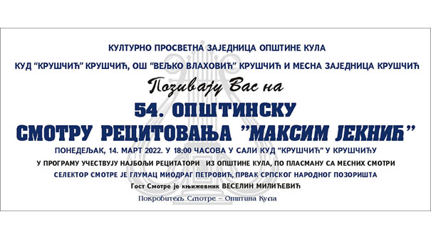 На Општинскей смотри „Максим Єкнич” у Крущичу ше у трох возростох буду змагац 30-еро рецитаторе – тринацецеро з Кули, осмеро з Руского Керестура, шесцеро зоз Червинки и по єдно зоз Крущичу, Липару и Сивцу.