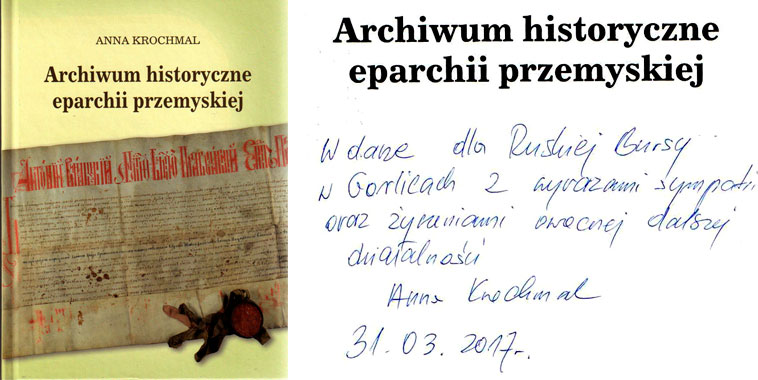 Запрашаме до выслуханя реляциі з промоциі книжкы пн. Історичний архів перемышльской єпархіі. Авторка той публикациі, др Анна Крохмаль, оповідат про тото, чом рішыла написати таку книжку, в якых обставинах до того дошло і очывидні – што мож найти в публикациі. А найти мож вельо цінных інформаций, тыкаючых архівальной спадковины по Грекокатолицкым Єпископстві в Перемышли, якє находит ся тепер в Державным Архіві в Перемышли.
