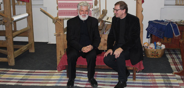• На фотцї злїва: проф. ТгДр. Мілан Ґерка, к. н., і ТгЛіц. Франтїшек Крайняк у дружнїй дебатї в Музею русиньской културы у Пряшові.