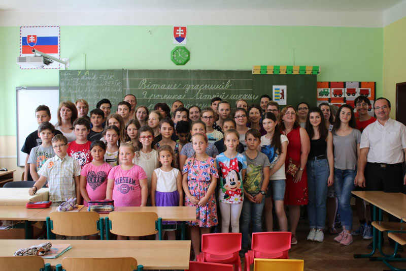 Школярї і участници тогорічной лїтнёй школы сфотоґрафовали ся на памятку по годинї русиньского языка в ОШ із МШ Михала Сопіры у Радвані над Лабірцём і з єй директором Мґр. Мареком Ґаём (першый справа).