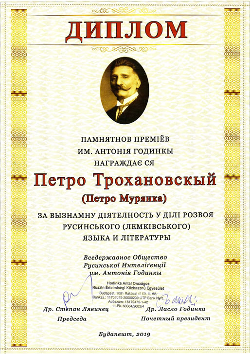 В днях од 8. до 9. лютого/фебруара 2019 рока на Мадярах, в столичным місті Будапешт, Русины святкували Дни Памяти Антония Годинкы. В тым році выріжненый і нагородженый остал медже інчыма лемківскій поета, писатель, тлумач та вызначный діяч – Петро Трохановскій-Мурянка.