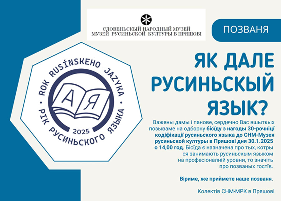 СНМ – Музей русиньской културы у Пряшові позывать одборну публіку, котра ся занимать або поужывать русиньскый язык на Словакії, на бесїду Як дале русиньскый язык?, котра ся одбуде 30. 1. 2025 од 14.00 год. у споминанім музею у Пряшові на ул. Масариковій ч. 20. Віриме, же бесїда буде кроком допереду в розвитку русиньского літературного языка на Словакії.