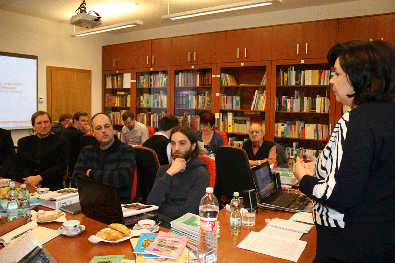 Погляд на часть участників шыршого кругу языковой комісії при Інштітутї русиньского языка і културы ПУ у Пряшові, ку якым ся пригварять єдна з главных особ той комісії, директорка інштітуту – доц. ПгДр. А. Плїшкова, ПгД. (справа). Фотка З. Цітряковой.