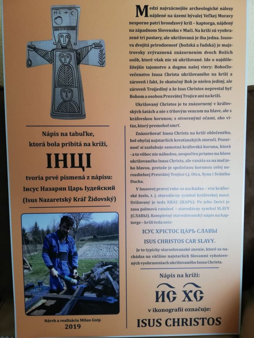 Меджі найцїннїшы археолоґічны найджіня на теріторії бывшой Великой Моравы є безспорно візантійскый хрест-капторґа, найденый у западній Словеньскій Мачі. На хрестї суть зображены три поставы, але укрижована є лем єдна. Ісуссова подвойна природность (божска і людьска) є майстровскы зображена в подобі двох Божскых особ, котры але не суть укрижованы. Іде о найважнїшу тайность і доґму нашой віры. Богочоловічество Ісуса Хріста укрижованого на хрестї і єдночасно факт, же дійсный Бог не є єдиный, але єдночасно Тройєдиный а же Ісус Хрістос не перестав быти Богом і особов Пресвятой Тройцї на хрестї.