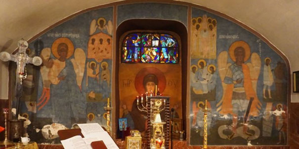 Част декораций то фіґуральны поліхроміі представляючы євангелистів, апостолів, пророків і святых та біблийны сцены і сцены з жытя Богородиці. В олтари поміщена є ікона Божой Матери Оранты та архангелы. Композициі в храмі вірных вказуют сцены з жытя Мариі.