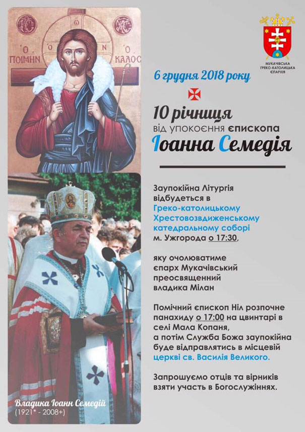 В найблизший четвер, 6. грудня/децембра 2018 р., мукачівска грекокатолицка єпархія припоминала буде 10. річницю смерти єпископа Йоана Семедія, якій через більше як два десятлітя завідувал том русиньском підкарпатском єпархійом.