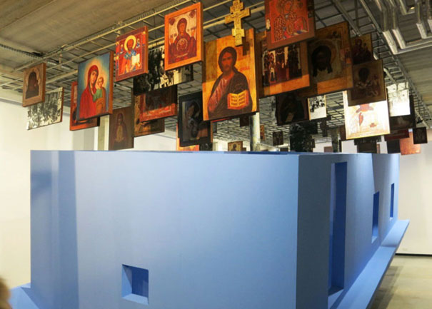 В невеличкій ґалериі 66P во Вроцлаві станула монументальна інсталяция знаного артисты Леона Тарасевича – одверненый горізнач блакітный дім, а над ним святы образы, знимкы выселінь вельох наций.