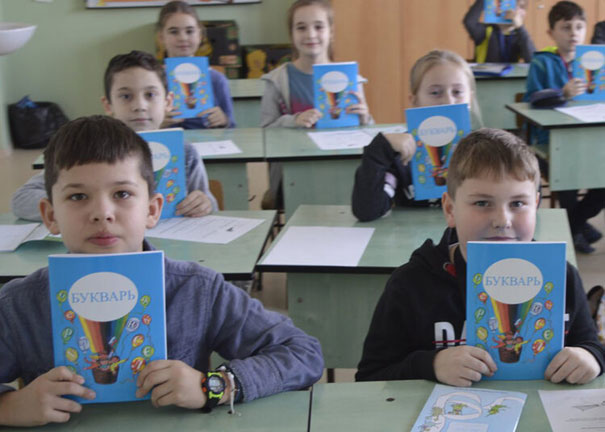 • Школяры тримуть у руках Букварї, котры 1994 року выдала Русиньска оброда, а тыж у 2006 і 2015 выдала редакції Русина і Народных новинок із Пряшова.