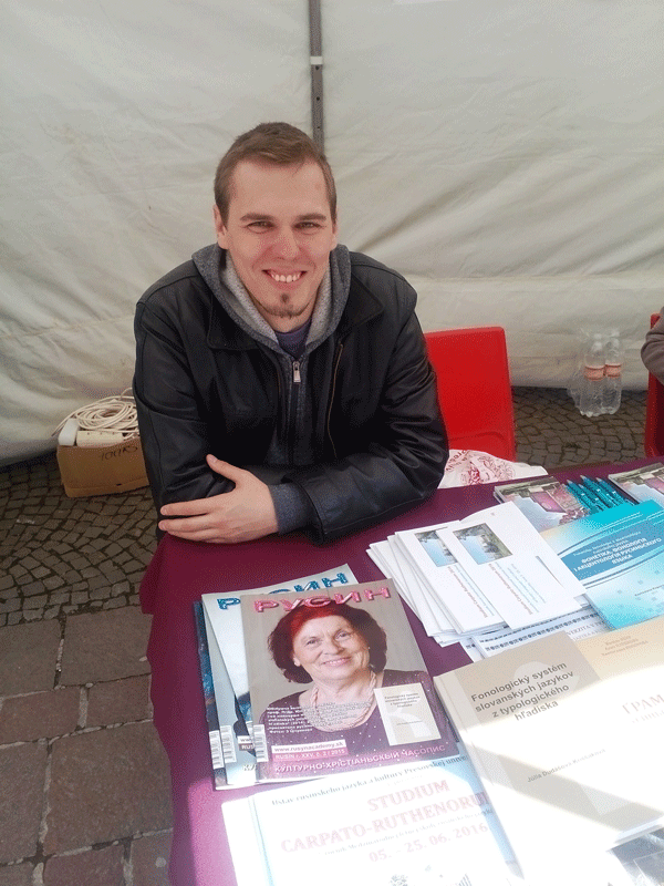 • Vrámci akcie Univerzita mestu – mesto univerzite 26. apríla 2016 v cetre mesta Prešova boli aj stánky, medzi ktorými aj propagačný stánok Ústavu rusínskeho jazyka a kultúry, pri ktorom záujemcov informoval doktorand tohto ústavu Michal Pavlič (na fotke).