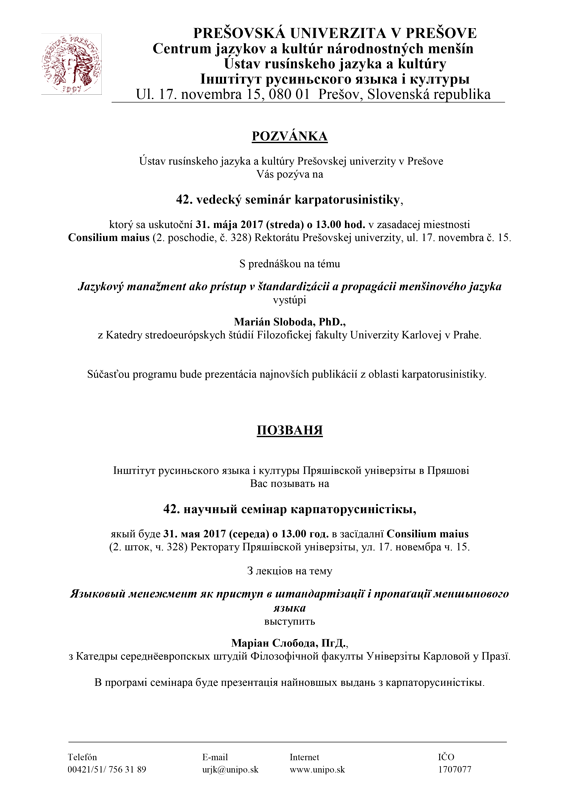 Вас позывать на 42. научный семінар карпаторусиністікы, якый буде 31. мая 2017 (середа) о 13.00 год. в засїдалнї Consilium maius (2. шток, ч. 328) Ректорату Пряшівской універзіты, ул. 17. новембра ч. 15.