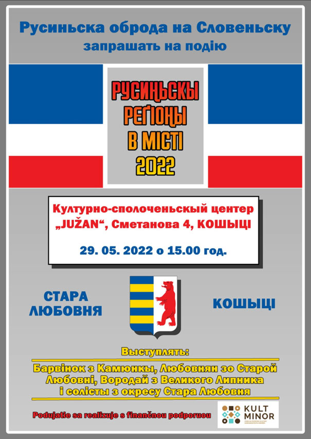 Найближе з русиньсков културов з реґіонів можете стрїтити ся в Кошіцях в неділю 29-го мая 2022-го року в просторах центра Южан.