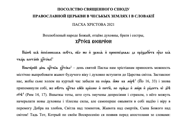 Приносиме вам Посолство Священного сіноду Православной церькви в чеськых землях і в Словакії, котре было выдане з нагоды празднованя Пасхы Хрістовой 2021-го року.