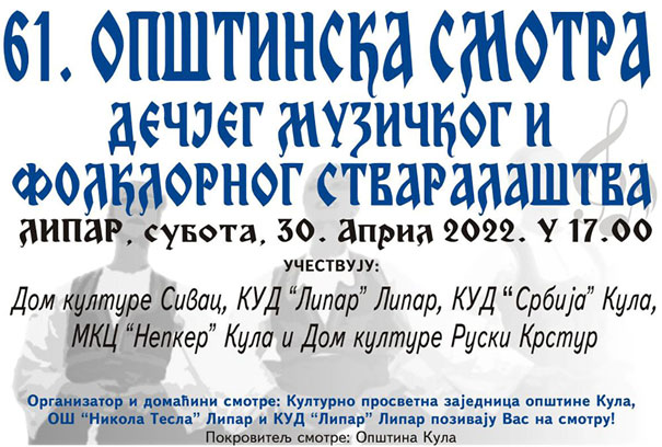 РУСКИ КЕРЕСТУР/ЛИПАР – На соботу, 30. априла з початком на 17 годзин, у Липару будзе отримана 61. Општинска смотра дзецинскей музично-фолклорней творчосци на хторей буду участвовац фолклорни ансамбли з местох кулскей општини у младшим и старшим возросту.