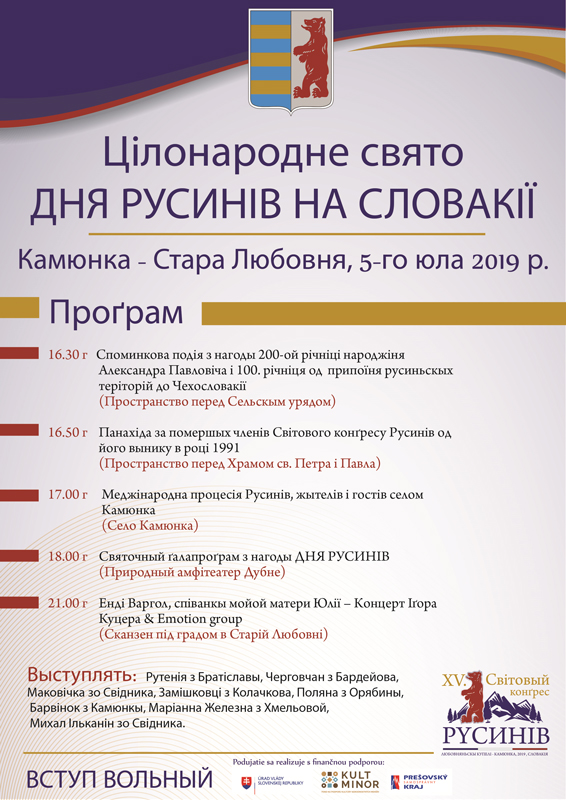 Кедьже тот рік Русины на Словакії орґанізують Світовый конґрес Русинів, Русиньска оброда на Словеньску як головный орґанізатор вырїшыла святковати День Русинів Словакії в рамках конґресу. Святочный проґрам є приготовленый на пятніцёве пополїдне в Камюнцї.