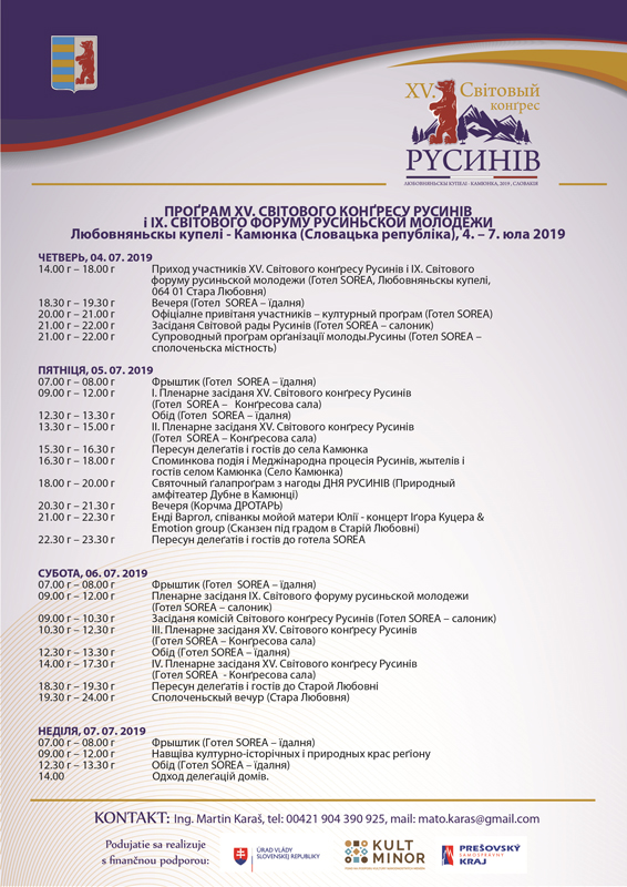 В днях 4-го аж 7-го юла 2019-го року буде в Любовняньскых купелях проходити 15-ый Світовый конґрес Русинів. Конґрес ся вертать на Словакію по довгых роках.