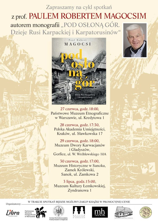 Варшавска стріча была першом, яка промує выданя книжкы «Pod osłoną gór. Dzieje Rusi Karpackiej i Karpatorusinów». Хто не встиг до Варшавы, має іщы шансу быти в краківскій Польскій Академіі Знань. Бесіду з проф. Маґочійом проведут там др габ. Олена Дуць-Файфер, проф. ЯУ та др габ. Анджей Зємба (28. червця/юнія, о год. 17.30). На дальшу – в середу, 29. червця/юнія, о 18.00 год. – просит до своіх просторів Музей Дворы Карвациянів і Ґладышів в Ґорлицях. Стрічу вюл буде др габ. Ян Пісуліньскій, проф. РУ. Дві послідні стрічы пройдут в Саноку в Історичным Музею 30. червця/юнія о 17.00 год. і в Музею Лемківской Культуры в Зындрановій – 3. липця/юлия о 15.00 год.
