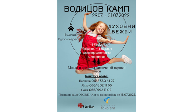 РУСКИ КЕРЕСТУР – Духовни вежби за дзеци и младих, або Водицов камп, почина на пияток 29. юлия и будзе ше отримовац по нєдзелю, 31. юлий. Сход учашнїкох у Водици на 16. годзин, а тема кампу „Мария модел совершеного чловека”.