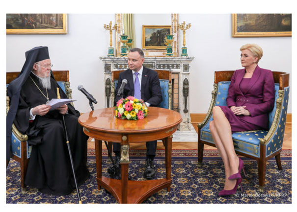 В понедільок, 28. марця, патріарха стрітил ся з президентом Польской Республикы Анджейом Дудом і першом дамом Аґатом Корнгаузер-Дудом. Президентска пара приняла гостя в Бельведері. Вчас стрічы представник константинопольской Церкви дякувал польскому президентови за запрошыня. Варфоломій І в своім выступліню выразил вдячніст, што польскы громадяне сильно помагают і сперают украіньскых біженців.