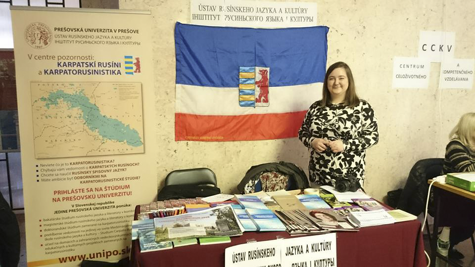 • Перед станком Інштітуту русиньского языка і културы ПУ в рамках Дня отвореных дверей на ПУ стоїть інтерна докторадка інштітуту З. Цітрякова, котра высвітлёвала можности штудія русиньского языка і літературы.