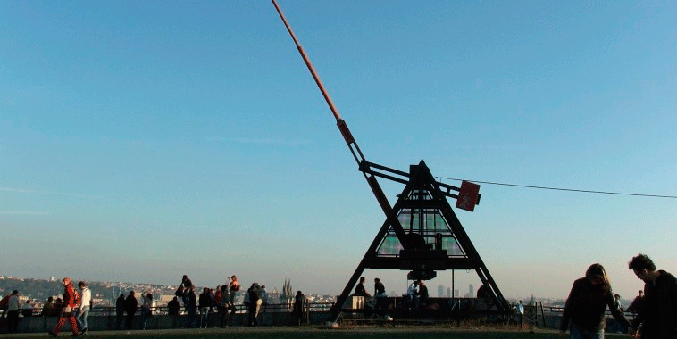 Празьскый метроном, котрый стоїть на місцї, де стояв найквешый на світї Памятник Сталіна, людми втогды посмішнї называный „фронта (позн. ред.: шор) на мясо“. Жрідло: Wikipedia.