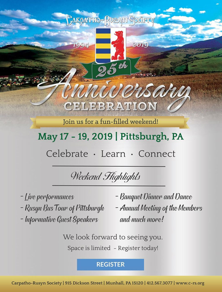 Карпаторусиньскє Общество в Зъєднаных Штатах Америкы того рока празднує ювілей, 25-літя діяльности. В остатніх днях на сайті той еміґрантской орґанізациі вказал ся детальный проґрам упамятнінь, якы заплянуваны сут на вікенд 17.-19. мая 2019 р.