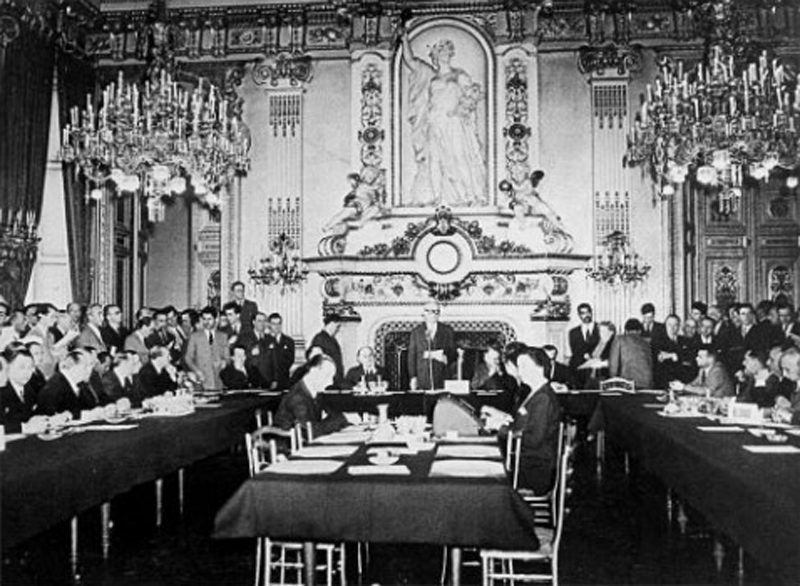 На фотоґрафії: Підписованя Шумановой декларації. Жрідло: Wikipedia. (Позн. ред.: Терміном Шуманова декларація ся означує выступлїня французького міністра загранічных дїл Роберта Шумана з 9. мая 1950, в котрім запропоновав вытворити Европске сполоченьство угля і оцели (ЕСУО), котрого члены бы сполочно рядили продукцію тых комодіт. ЕСУО (закладаючіма членами были: Франція, Нїмецька сполкова републіка, Італія, Голандія, Белґія і Луксембурґ) было першов із наднародных сполоченьств, котры ся поступно споїли до днешнёй Европской унії.
