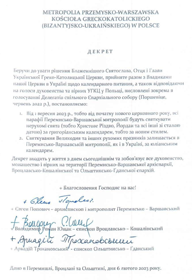 Грекокатолицкы владыкы в Польщы днешній декрет о зміні календаря арґументуют м.ін. так: «Беручы до увагы рішыня Блаженнійшого Святослава, Отця і Главы Украінськой Грекокатолицкой Церкви, приняте разом з Владыками нашой Церкви на Украіні што до календарного вопросу, а тіж одповідаючы на голосы духовенства та вірных УГКЦ в Польщы (…)».