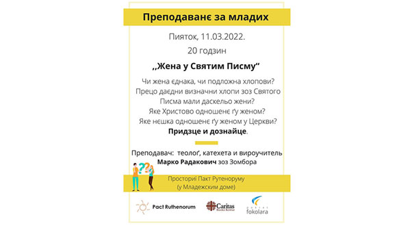 РУСКИ КЕРЕСТУР – На пияток, 11. марца на 20 годзин, будзе преподаванє за младих на тему „Жени у Святим Писмуˮ, а тема вибрана з нагоди актуалного означованя Медзинародного дня женох. Преподаванє отрима млади теолоґ Марко Радакович зоз Зомбора.