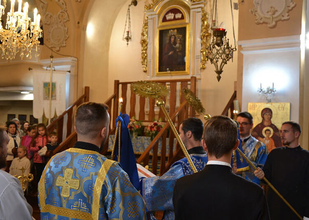Перед торжественнов літурґіёв віруючі помолили ся ружанець і Акафіст ку Пресвятій Богородіцї. Архієрейску літурґію одправляв архієпіскоп Кіріл Василь, кошіцькый єпарха, котрый мав і проповідь, а вєдно з ним служыв кошіцькый ємерітный єпарха владыка Мілан Хаутур, як і далшы священици а діаконы.